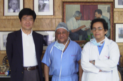 Dr Yoshioka with Dr K.M Cherian (Chairman & CEO Frontier life line, Dr KM Cherian Heart foundation, Chennai, India) and Dr Soma Guhathakurta, Cardiac surgeon., on the 5th April 05 at Frontier life line hospital. @ The potentials of polymers developed in Japan in 3D cell culture and transformation of Bone marrow cells to cardiomyocytes and their clinical application in cardiology were discussed. |