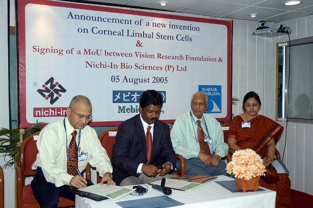 Subsequent to the earlier MoU signed for basic research using Mebiol Gel, a special press meet was convened to announce the outcome of the earlier work and to announce about the new MoU signed for a further advanced research using Mebiol Gel among Nichi-In Bio Sciences (P) Ltd(NBS) and Vision Research Foundation- Sankara Nethralaya (VRF) on the 05th of August 05 at the Conference hall of Sankara Nethralaya.