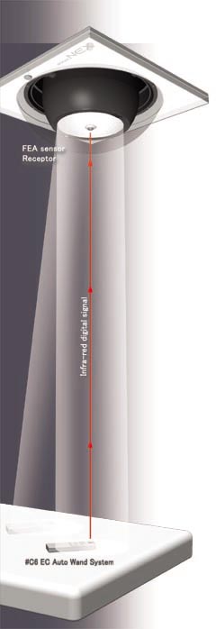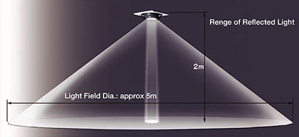 FEA Sensor The FEA, "Fish Eye Alley", sensor is embedded in the center of the surgical lamp, receives the digital infra-red beam emitted from the EC remote control, peocesses it instantly, and then uses this data to drive the gyro mechanism that adjusts the position of the light. Range and High Luminescence A large cold mirror reflector (205 mm) and Super Halogen 24V-100W bulb are used together to provide a quality shadowless, cool beam of light approximately 20 cm in diameter of approximately 30,000 lux up to 1.7 meters away from the lamp head.The gyro mechnism responds to control within 2 m directly below and within a phenomenal lateral radius of up to 5 m below the lamp head. (Refer to the illustration below.) ![]()